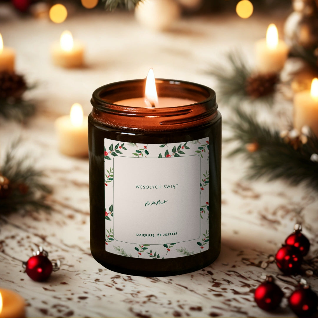 💌 Personalizacja – świeca zawiera napis „Wesołych Świąt!”, ale możesz wpisać dowolny tekst, który chcesz umieścić na etykiecie.
